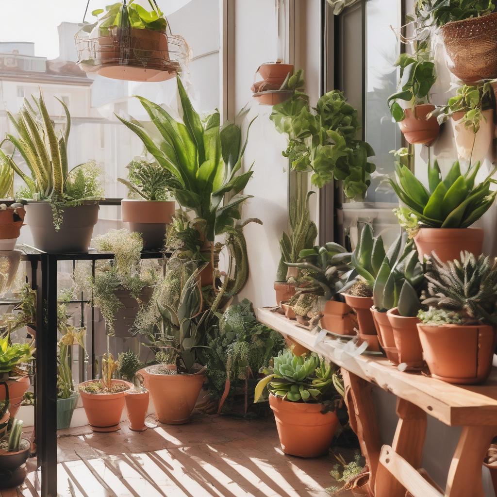 Plantas recomendadas: suculentas (Echeveria, Sedum), aloe vera, Sansevieria (lengua de suegra), Zamioculca (ZZ), pothos (Epipremnum) y romero para balcones soleados.